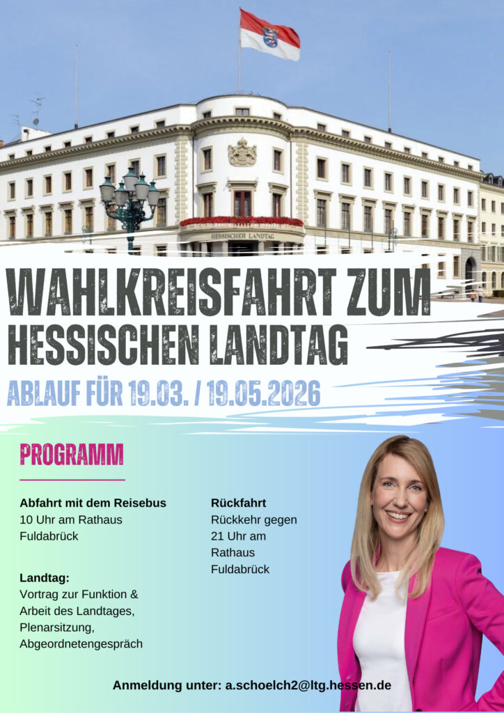 Unsere Mitgliedsfrau Anna-Maria Schölch lädt zu einer besonderen politischen Bildungsfahrt in den Hessischen Landtag ein. Diese Veranstaltung wird direkt von ihr organisiert und durchgeführt. Sie richtet sich nicht ausschließlich an unser Netzwerk – auch weitere Gäste werden teilnehmen.